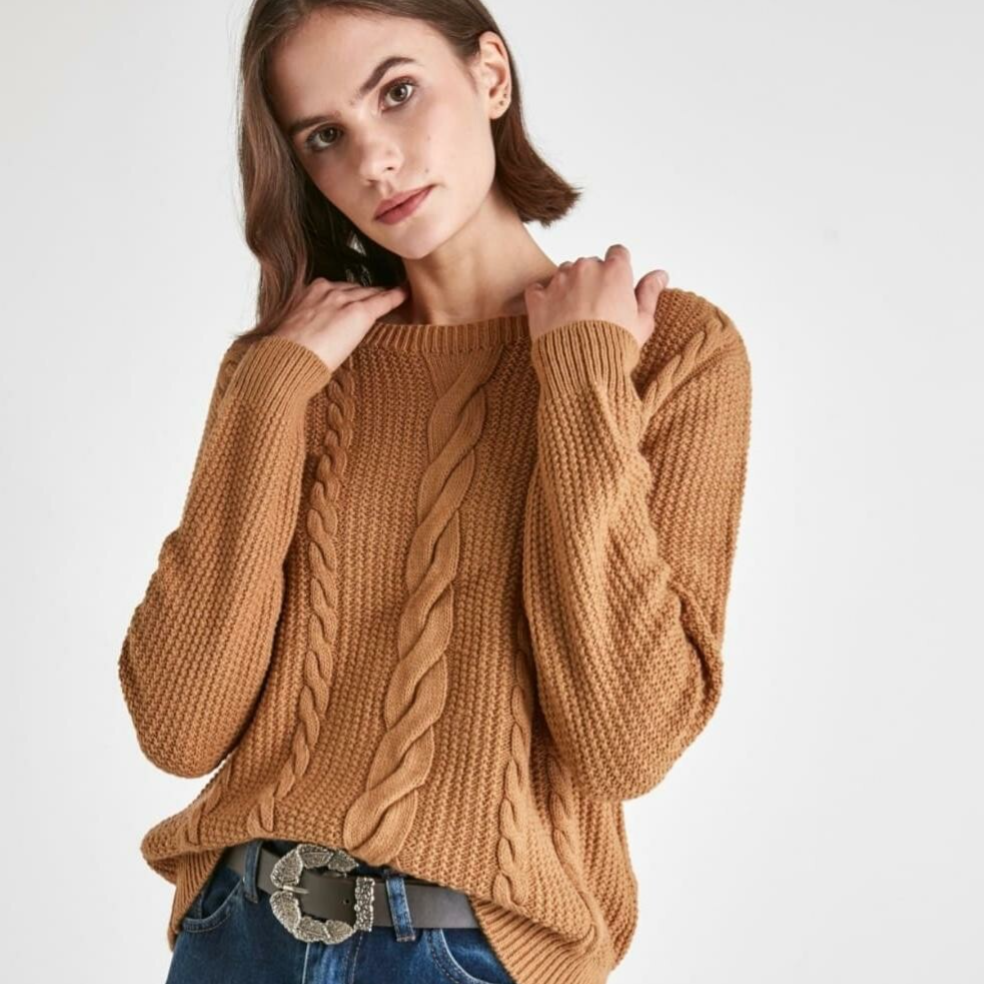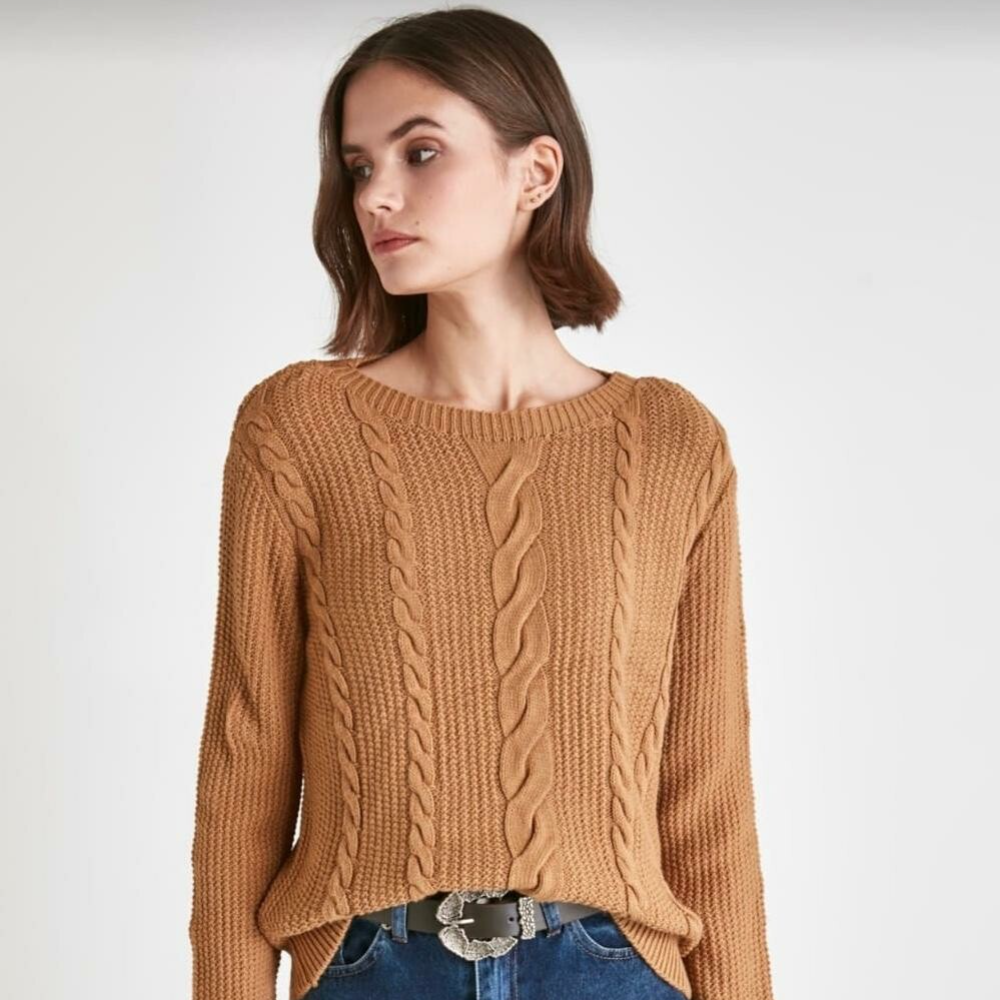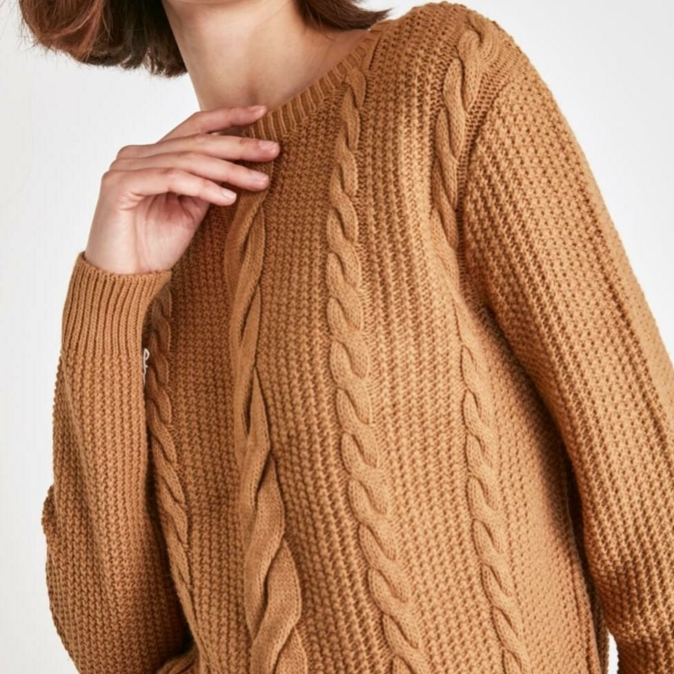 Een gebreide kabel sweater in dé herfst kleur van dit seizoen.